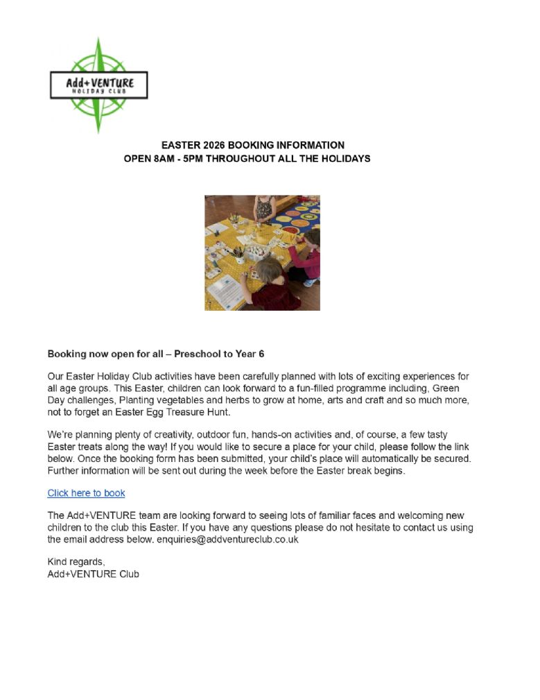 Add+VENTURE Wrap around care and holiday club is owned by Kat Gayler and Jemme Atieno. Kat and Jemme both have over 20 years' experience of working with early years children and have both managed and led early years settings. They launched Add+VENTURE Club in 2018 and became Ofsted registered in 2019, which allowed them to take children as young as 2 years. Add+VENTURE Club are in the process of this application for Widmer End. Their passion is to help working families like themselves, by providing an excellent childcare service, where children are well looked after in a safe, stimulating environment. Children at club learn their values: -