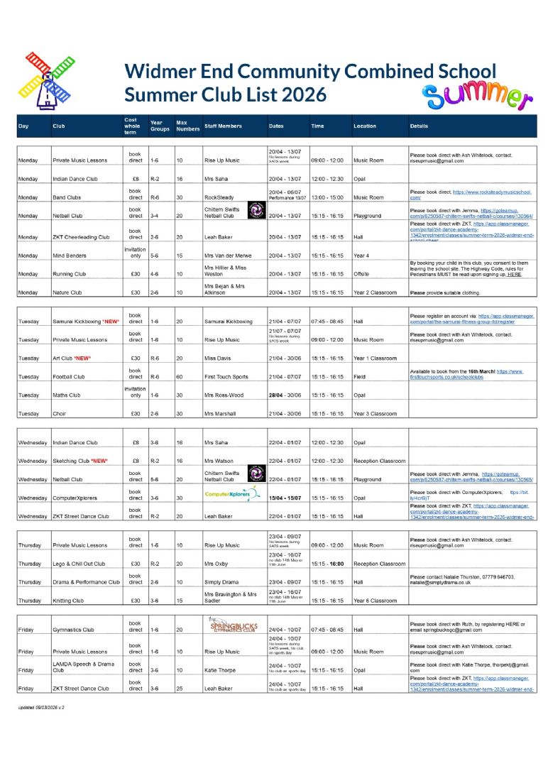 We are fortunate to be able to offer a variety of clubs throughout the year due to the dedication of Staff, Parent helpers and local coaches. As well as after school clubs we also offer peripatetic music lessons in Rock music, Guitar, Drums, Ukulele, Singing and Piano. We try to vary the age range that the club is aimed at so all children have a chance to attend clubs throughout the year. Children are able to sign up for 8-12 weeks of a particular club before the start of each term. They are encouraged to sustain their engagement with the club and commit to the learning provided.